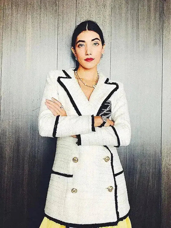 - Penutup: Bagian depan double-breasted dengan kancing warna emas