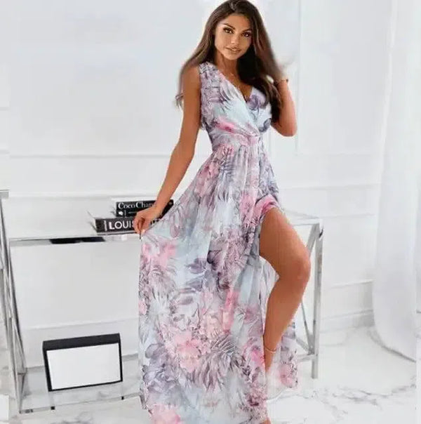 Musim Panas Sifon Cetak Renda-up Gaun Wanita Tanpa Lengan