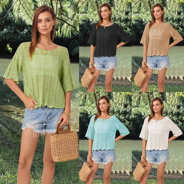 Pakaian Rajut Wanita Kasual Lengan Pendek Berongga Mode Berongga