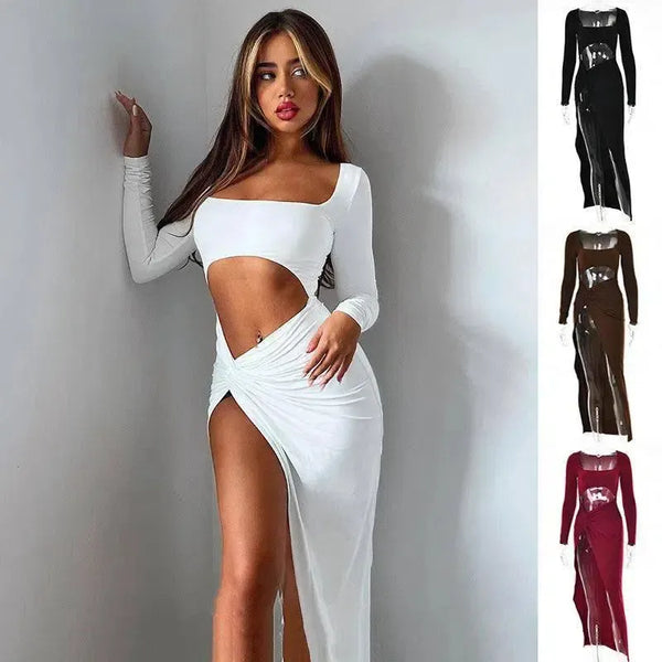 Pakaian Wanita Gaun Lengan Panjang Mode Busana Leher U-neck Split Dress Pesta Pernikahan