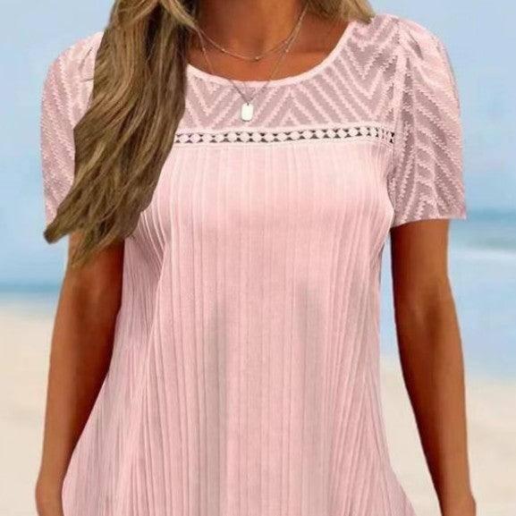 T-shirt lengan pendek dengan hiasan perca renda leher bulat pullover