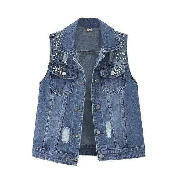 Jaket Rompi Denim Bertabur Aksen Tanpa Lengan