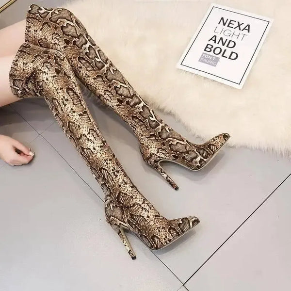 Sepatu Bot Peregangan Runcing Cetak Stiletto di Atas Lutut