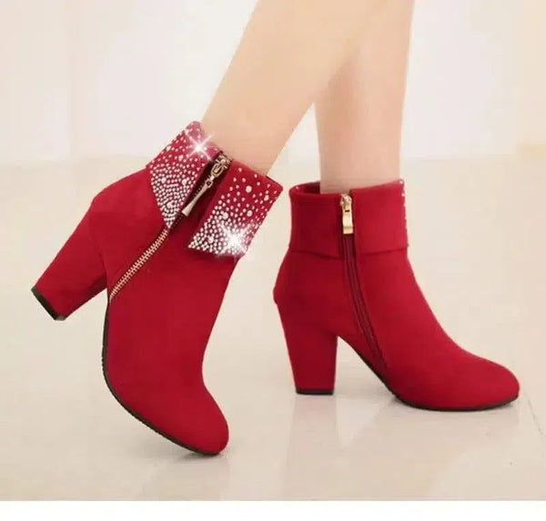 Sepatu bot wanita tumit pendek berbahan nubuck berlian imitasi