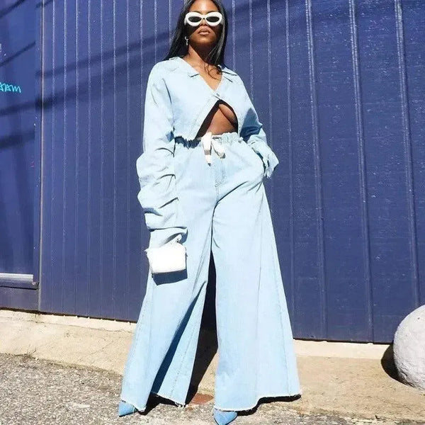 Setelan Denim Longgar Kasual Pakaian Wanita Dua Potong