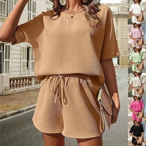 Setelan Wafel Baru Wanita Lengan Kelelawar Lengan Pendek Atasan Leher Kru dan Desain Serut Celana Pendek Mode Dua potong Set Pakaian Musim Panas