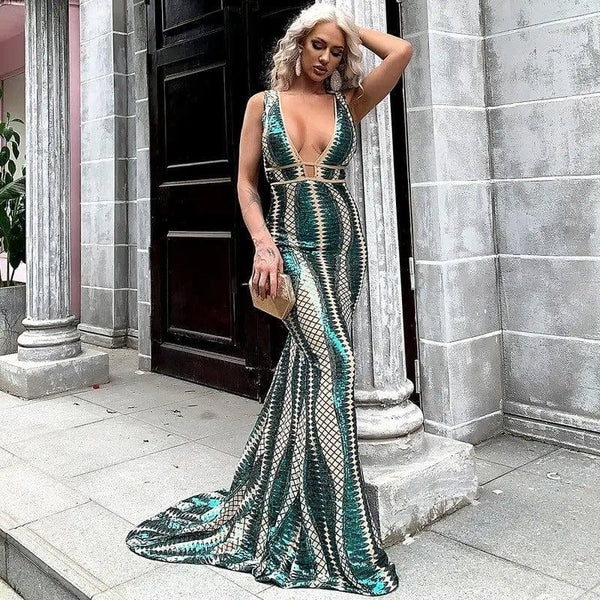Deskripsi Produk: Gaun Malam Bergaris Bergaris Tidak Beraturan Suspender Ekor Panjang