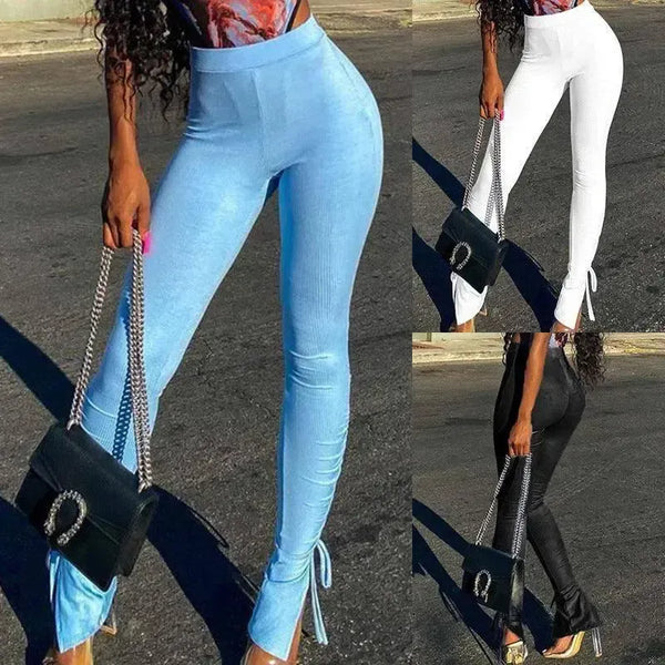 Wanita Modis Dengan Celana Pinggang Tinggi Ketat Berbelah Samping