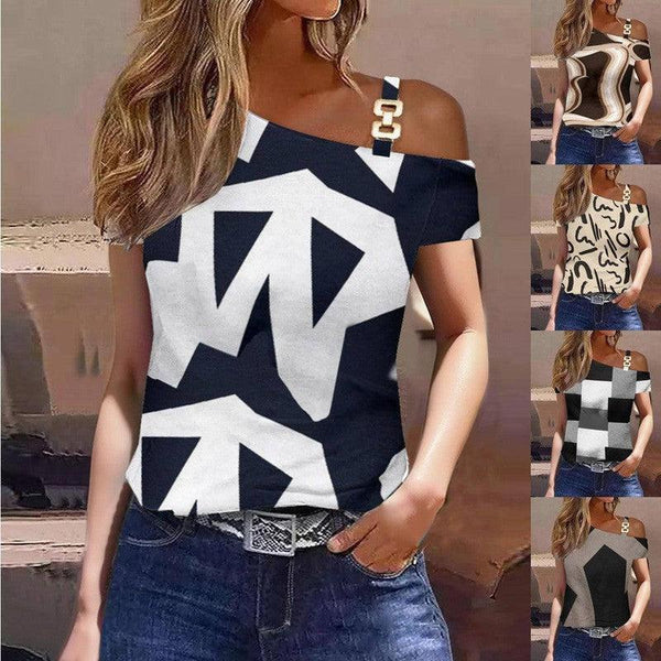 Kesederhanaan Musim Panas Wanita Cetakan Gesper Logam Lengan Pendek